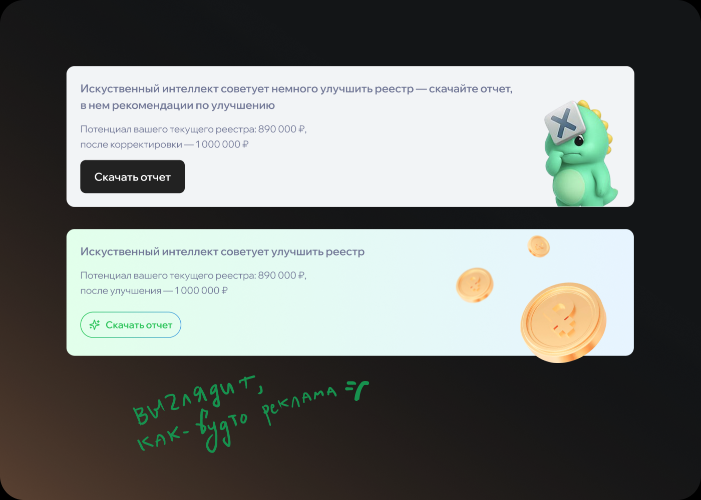 Отдаю продакту и разработке на ревью. Не забываю предупредить, что нужно посоветоваться с юристами, так как центральной идеей дизайна является придуманный мной термин «Потенциал оплат»