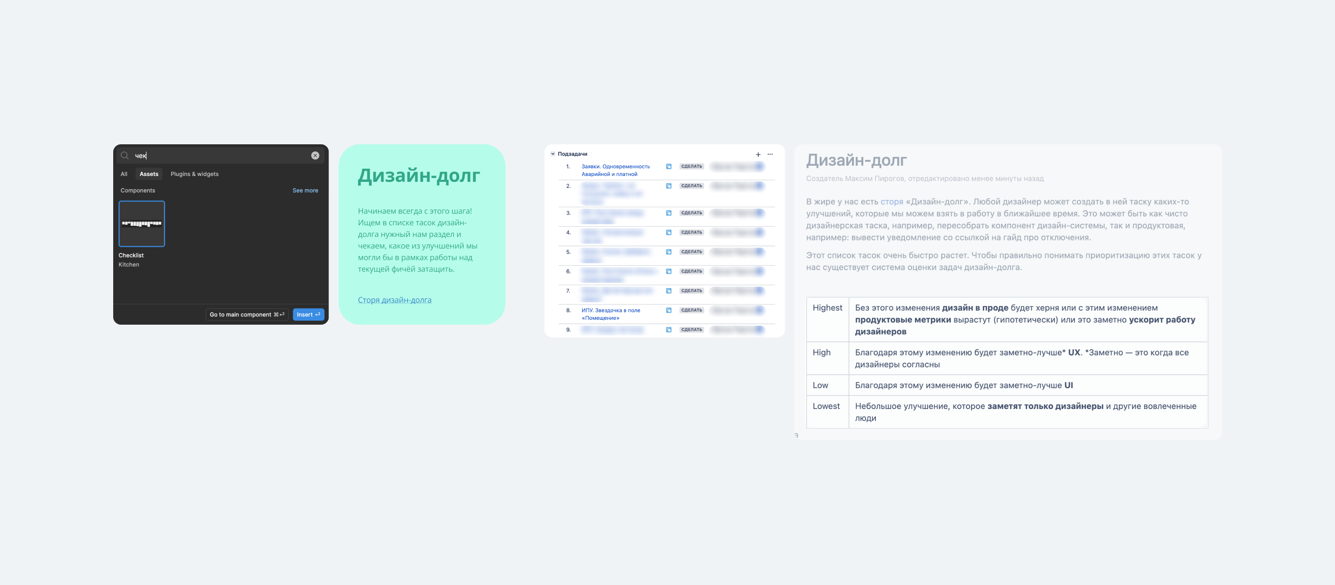 Решение. Каждый раз, когда у дизайнера возникает мысль что-то изменить в дизайне продукта — он добавляет эту задачу в специальную доску в Jira. Все задачи группируются по разделам продукта и маркеруются степенью важности. С понятным приоритетом, а не: S, M, L… Когда от продакта приходит очередная задача из роадмапа, дизайнер смотрит на доску дизайн-долга. Если есть подходящая задача для этого раздела — тихонечко, в рамках работы над продуктовой задачей, «прокидывает» изменение из дизайн-долга.